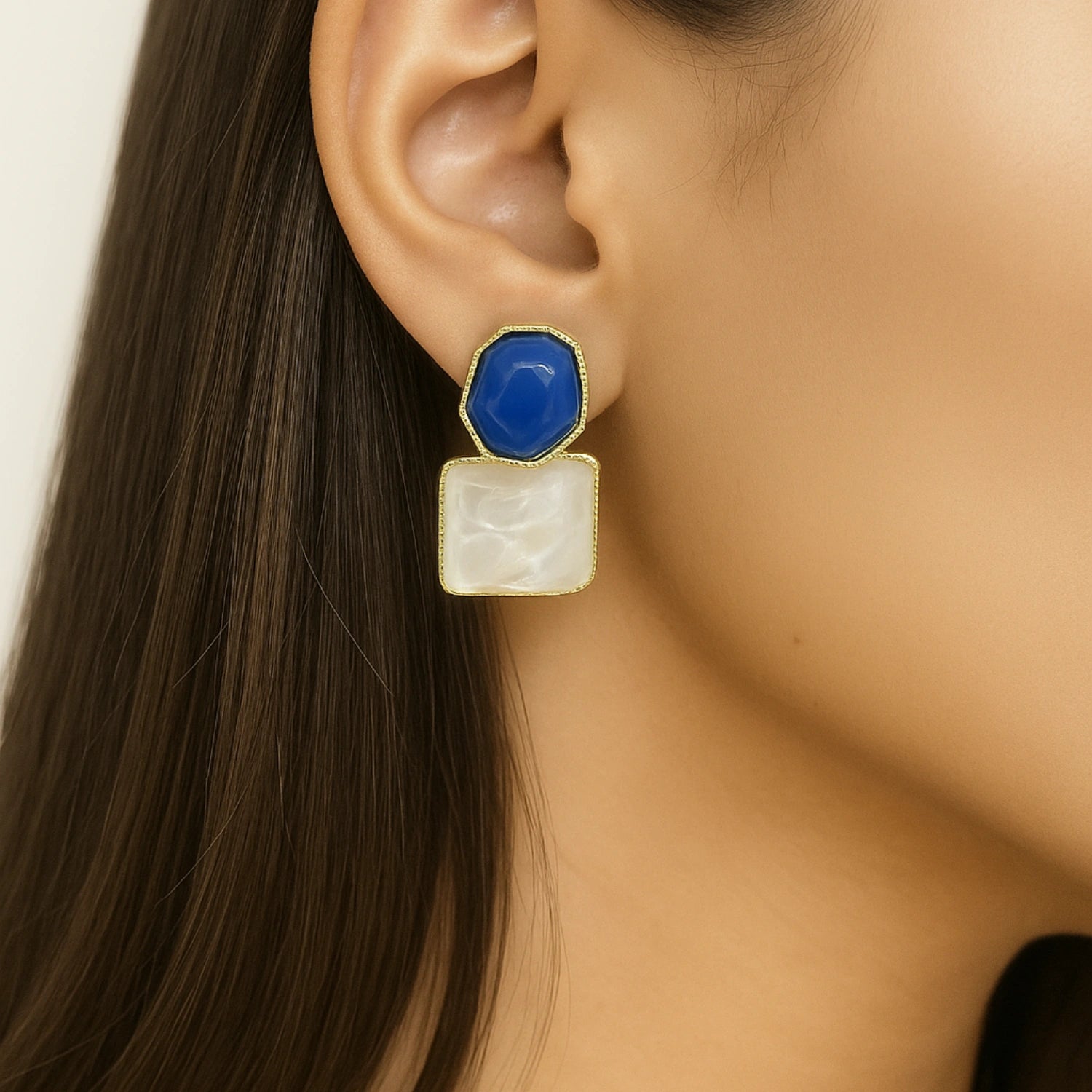 - Modern Geometric Design: Features unique asymmetrical blue and white matte resin stones framed in gold-tone metal for a contemporary, stylish appeal.